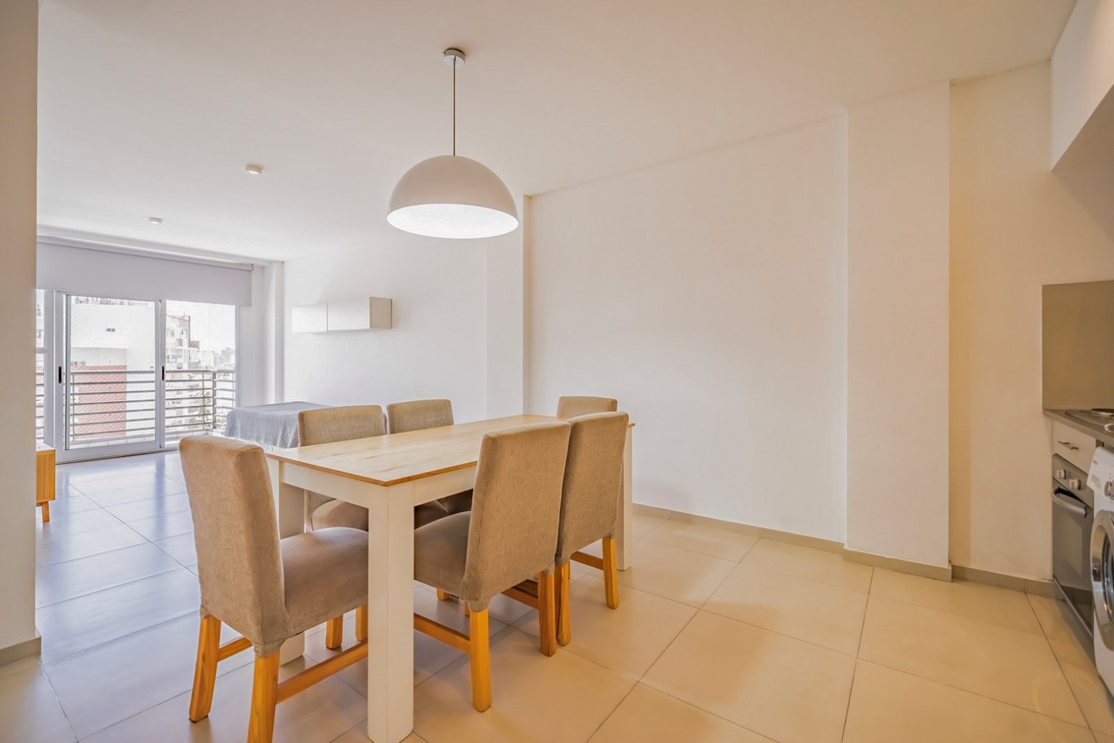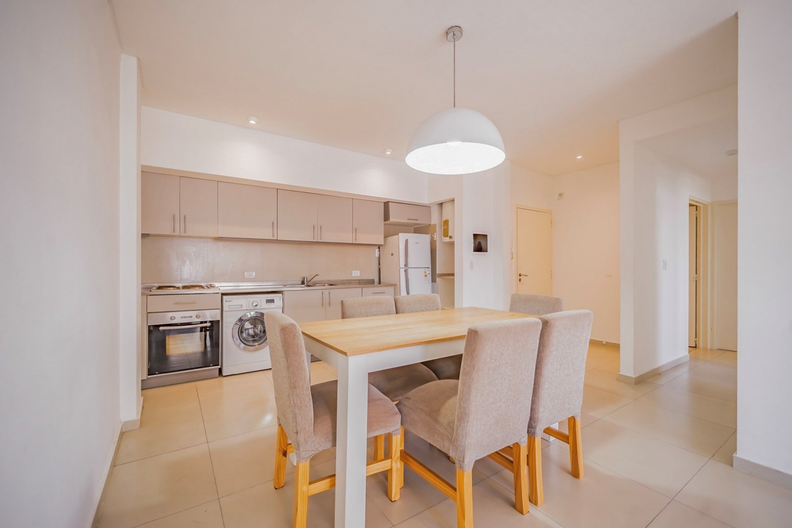Cocina integrada con electrodomésticos eléctricos y conexión para lavarropas.